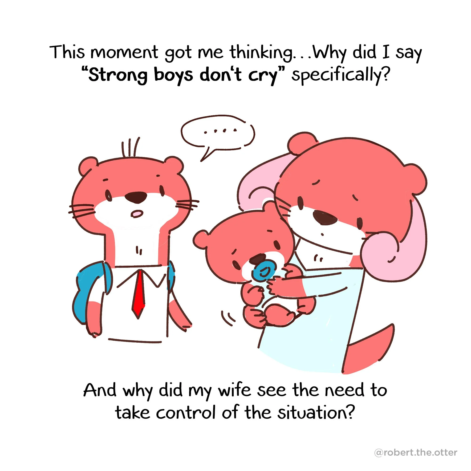This moment got me thinking. Why did I say "strong boys don't cry" specifically? And why did my wife see the need to take control of the situation?