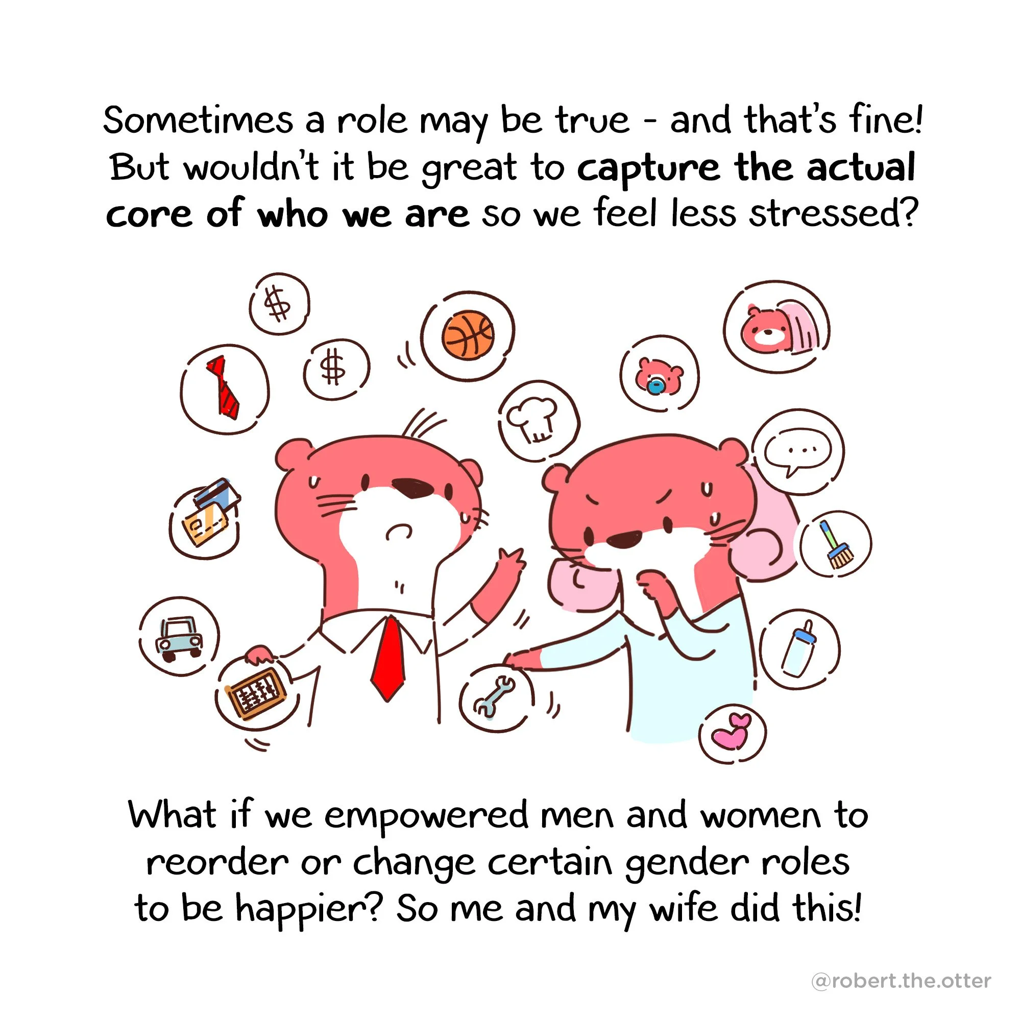 Sometimes a role may be true, and that's fine. But wouldn't it be great to capture the actual core of who we are so we feel less stressed? What if we empowered men and women to reorder or change certain gender roles to be happier? So me and my wife did this.
