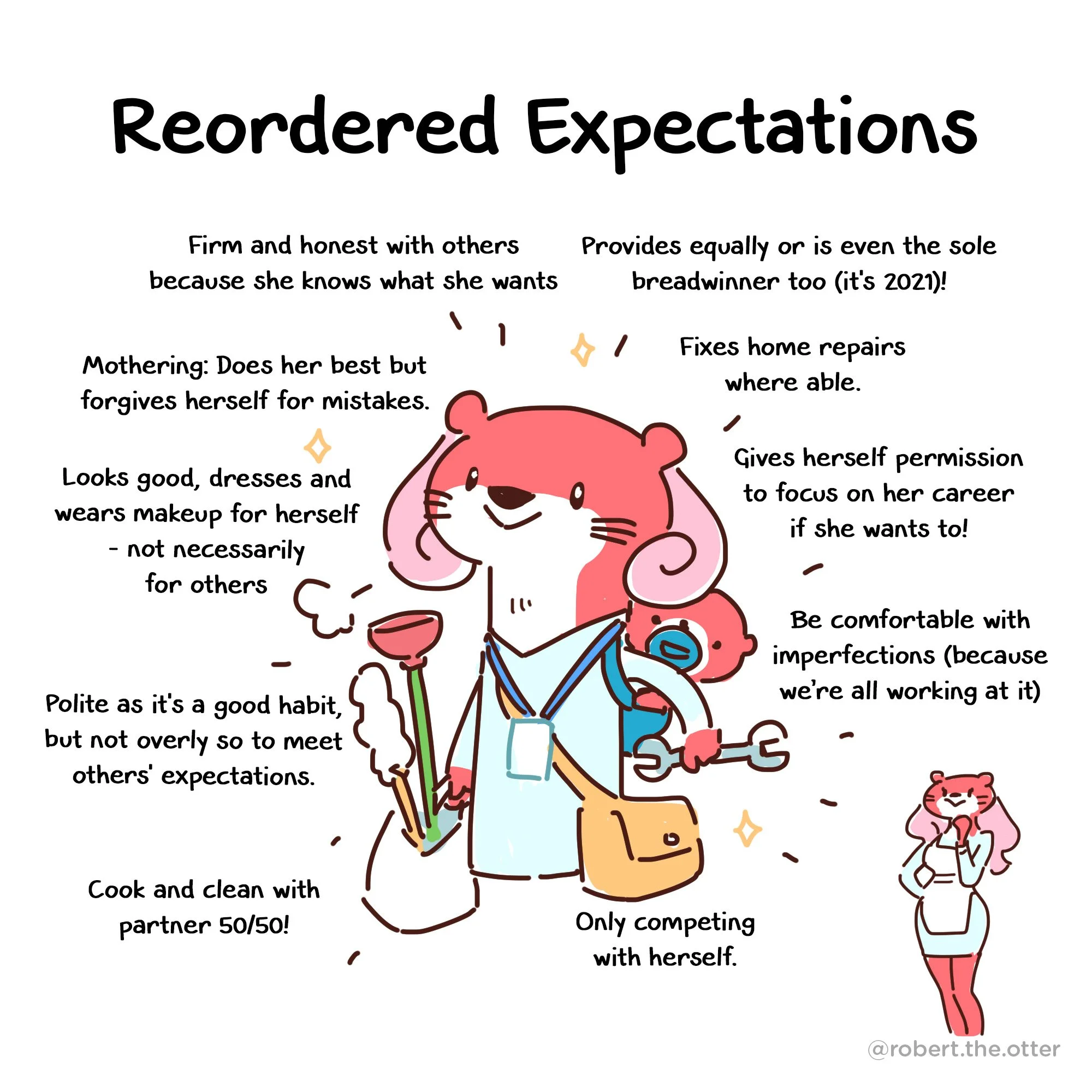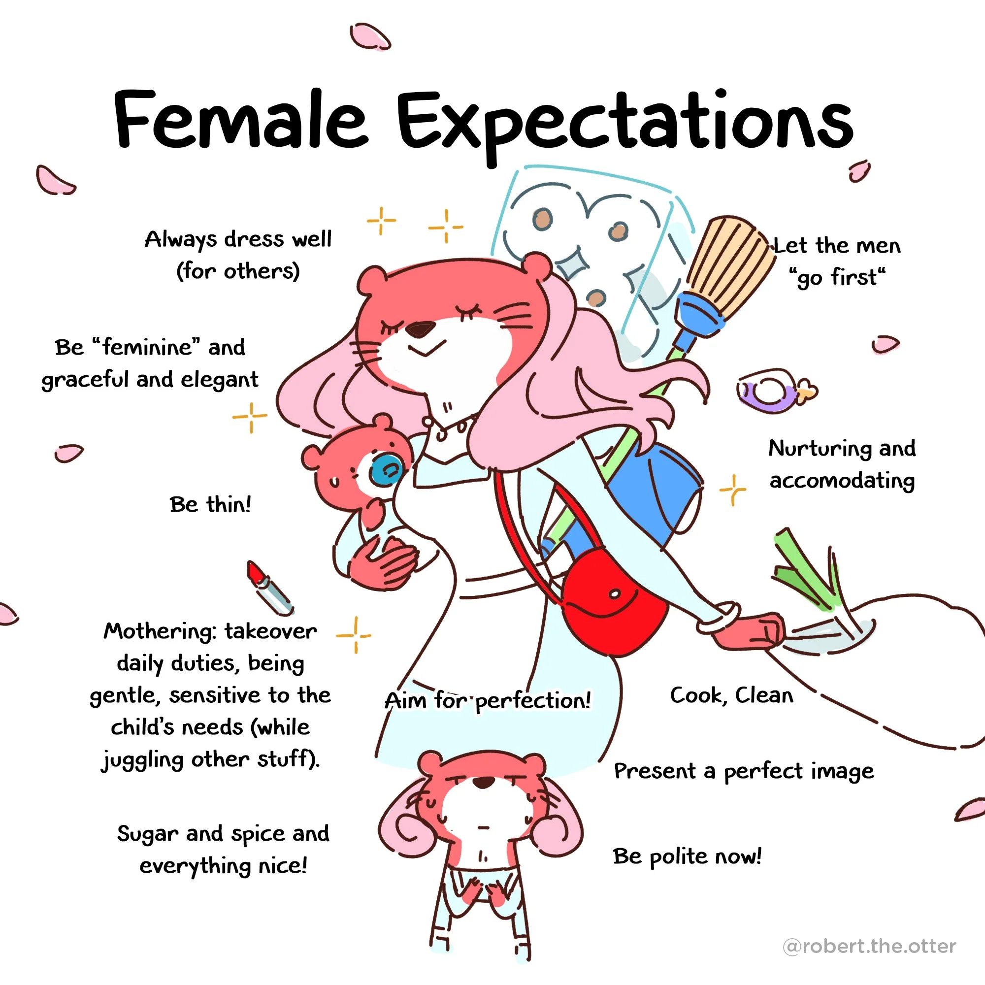 After talking, my wife and I agreed that we aren't our expectations. We're (otter) people. When we reinforce certain gender roles, we create superficial impressions and not our actual knowledge and abilities. It's stressful and inaccurate of who we are.